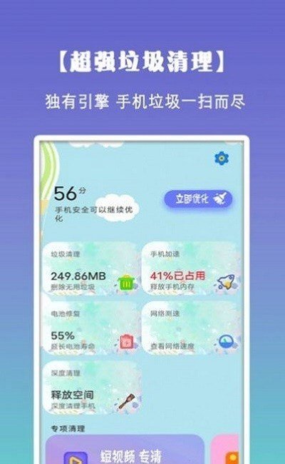 清理垃圾内存优化app是一款手机高效清理主软件,可以帮助用户轻松清除手机隐藏垃圾,手机空间优化垃圾清理助手玩游戏必备!随时查看手机的空间使用情况,同时还支持杀毒等功能,有效保护手机安全,提高手机运行速度,手机卡顿或者运行不流畅的时候可以使用这个清理垃圾内存优化app!感兴趣的用户快速点击下载!