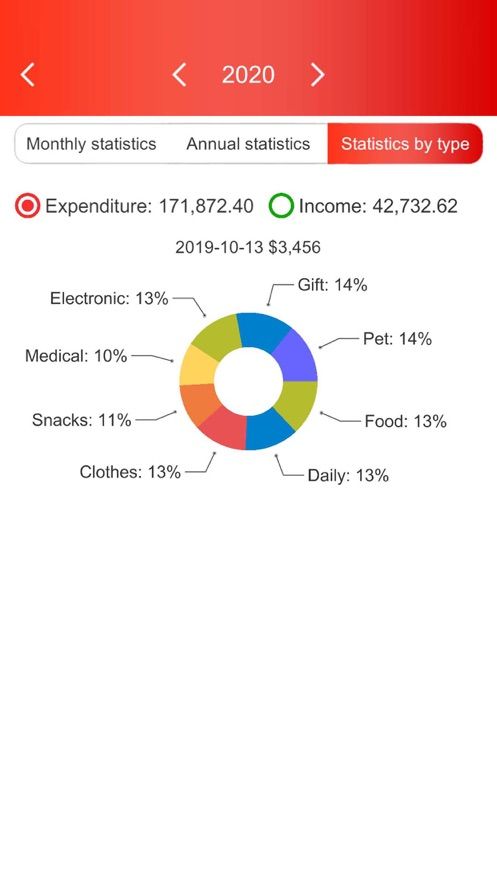 2、每个月的统计图都会在月底发放,在统计图上就可以看到各项消费的占比,更好的开源节流。