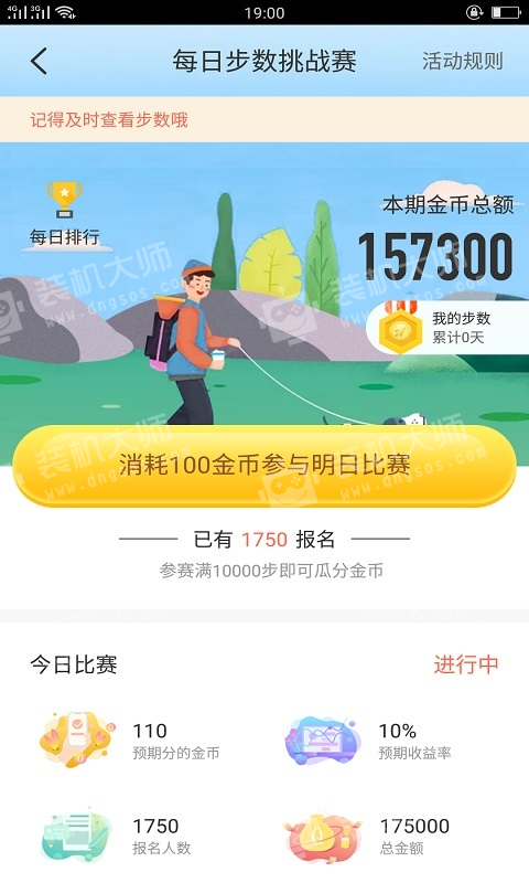 每日达到一定步数可通过点击[走走]页面一[领取金币]按钮,将阶段步数兑换成金币,每日有5次阶段步数兑换成金币,分别为2、1500、3000、4500、6000,当日不兑换则失效。