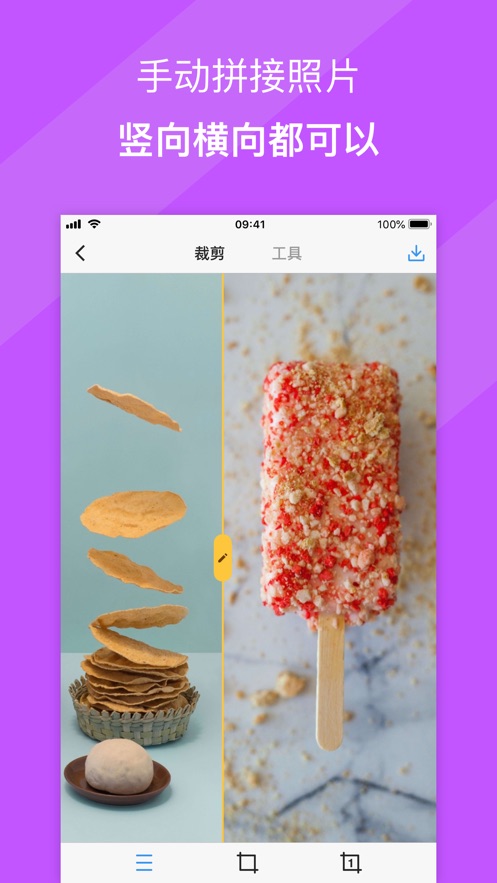 对于其他图片,你可以采用「竖向拼接」和「横向拼接」。在拼接的页面,选择一条边为基准,按照实际需要拖动图片,裁剪掉不想要的部分,点击保存即可完成拼接。