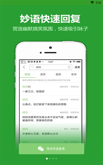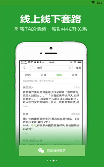 爱套路app是一款全新的撩妹神器,提供了多个场景对话语言,营造幽默搞笑的氛围,让你轻松轻松俘获美女的芳心,全新升级,各种幽默搞笑的套路、朋友圈装逼语录、还有搞笑的表情包,这些通通可以在软件中获得,学习更多妹技撩巧为了方便您查找相关的情景对话,所有我们提供了快捷搜索的功能。