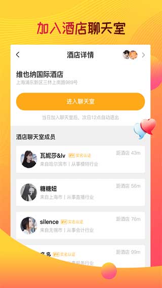 1、进入自己感兴趣的【酒店聊天室】,参与酒店群聊,联系同酒店的其他人。
