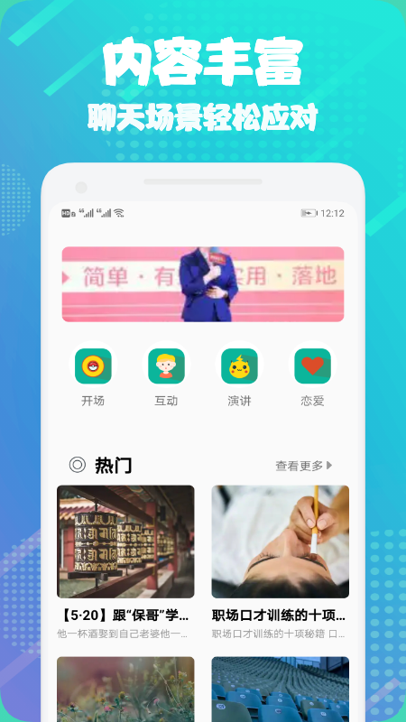 Potato聊天话术app是一款非常好的手机社交语音软件,该软件可以为用户提供不同场景下的聊天技巧和说话技巧,全部免费提供,可以不受任何限制,随时随地学习聊天互动技巧,语音学习体验也很好,它可以帮助用户在任何场景下以高情商进行交流!