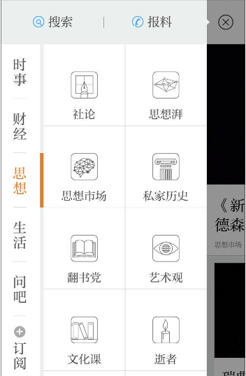 2、向左滑动,依次是问吧、时事、财经、思想、生活等默认栏目,您也可以点按右上角的图标来调整各版块的展示顺序;