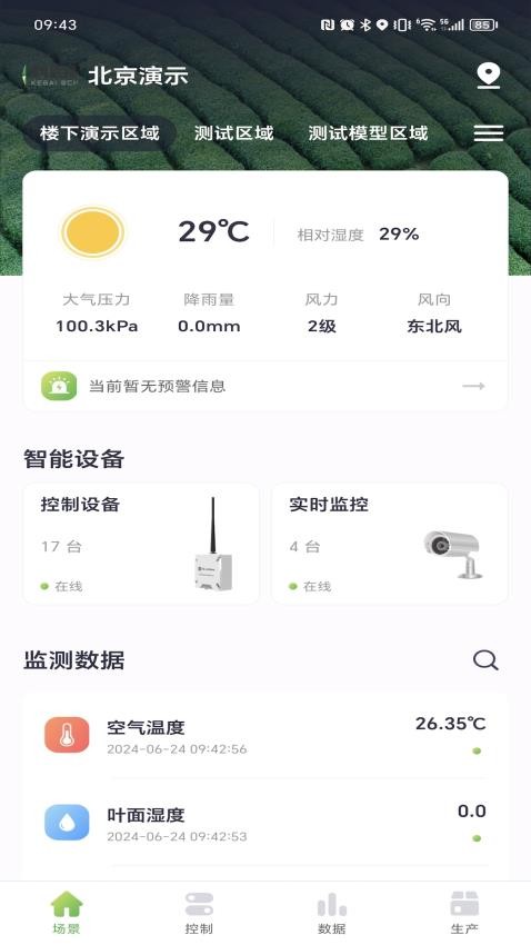 科百云田应用是一款非常高效的农业智能化作业管理软件,在这里可以非常方便清楚的监控指定区域的作物生长情况,通过云控平台,可以远程进行智能化器械的操作。软件中拥有非常庞大的农耕作业数据,能够全天侯实时监测管理田间信息,时刻防范意外情况的发生,保障农业生产的稳定。