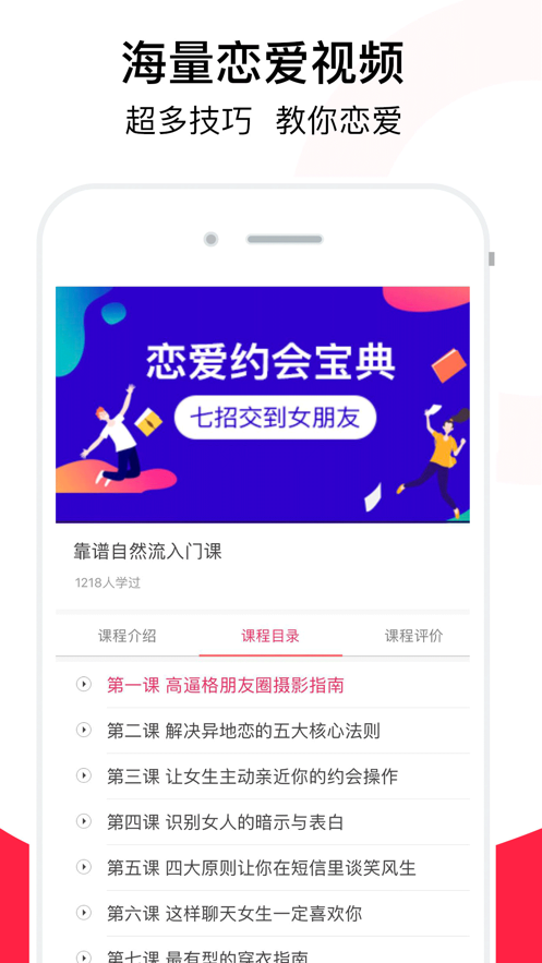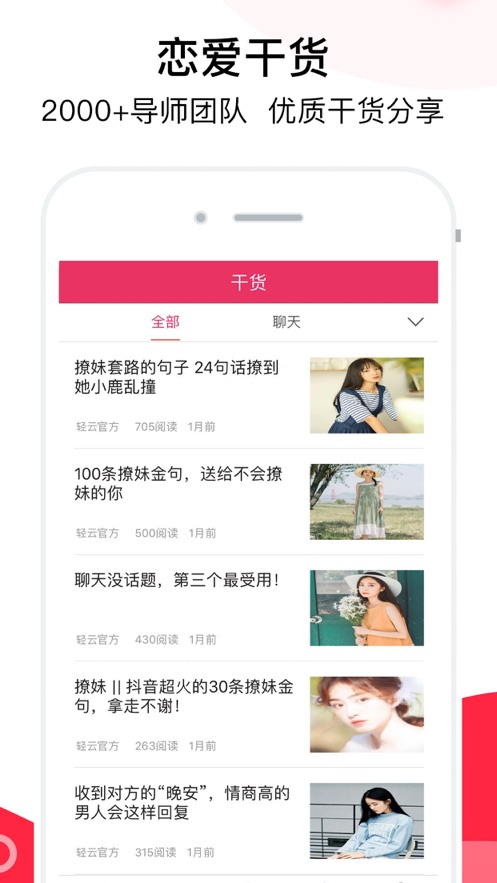 轻云交友app是一款能够帮助你快速成长为恋爱达人的手机软件,在这里拥有超多的恋爱话术以及成功恋爱的教学视频,帮助你能够快的获得异性的好感,走出尬聊的窘境,有兴趣的小伙伴欢迎下载体验!