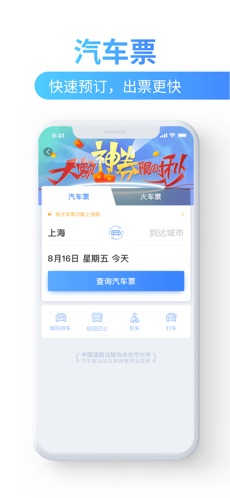 汽车票:车次随时查,车票随心订。提供全国200多个城市的汽车票实时查询服务;在线购票,免去排队烦恼,部分城市还可24小时为您提供购票服务,给您更加方便快捷的订票体验。