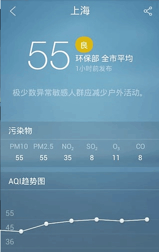 *空气质量实时报告,包含PM2.5、PM10等六项污染物,还有全国空气质量排行,查看你的城市空气排名。