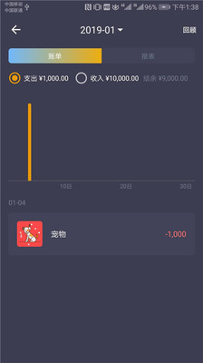 3、账单明确:根据支出进行统计,定制周统计、月统计、年统计,形成分析图,资金管理、账单流向、余额资产、消费趋势一目了然,有助于你轻松理财;