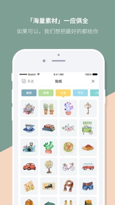 3. 然后再选择一个品类的贴纸对画布进行填充。不要以为这些萌萌哒的贴纸仅仅是女生的专属,男生的个人页也能做得很好看的。
