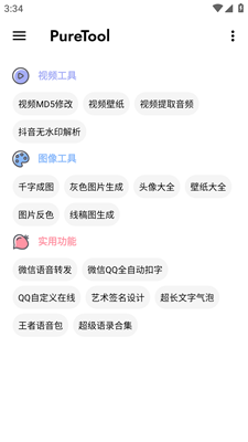PureTool手机工具箱中拥有超多实用的工具,如视频编辑、图片美化、聊天辅助等,为更多用户带来了便捷且实用的功能,应用的界面设计整洁清新,且使用交互流畅。PureTool应用中拥有实用的功能,是一个非常强大的手机工具箱应用,简单的功能交互操作就可以完成功能,应用体积小巧,不占用手机存储空间。