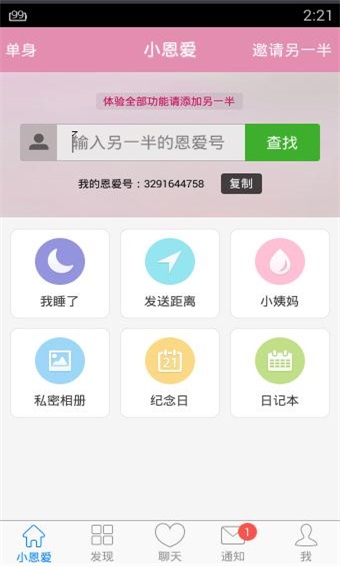 1)首先打开“小恩爱”,首先是添加好友,在“邀请”中点击一下。2)点击“邀请”之后,我们可以看到有“微信通知”、“qq通知”跟“短信通知”,选择其中一个通知,以“QQ通知”为例,选择好友就可以邀请成功了。3)等待你的好友注册成功之后,输入你的恩爱号,点击查找,然后在点击“确定”就可以成功的创建关系了。