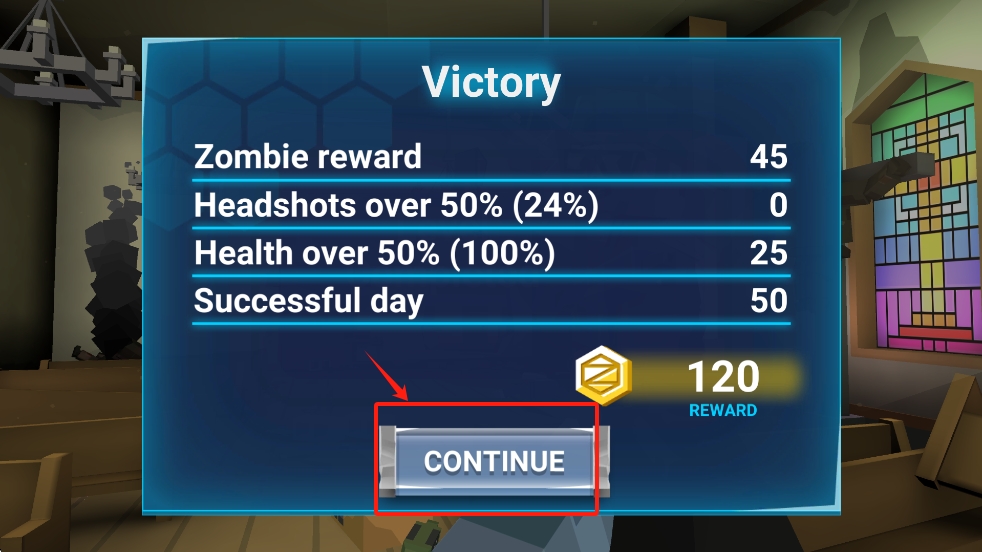 2、消灭所有敌人后,会出现胜利提示。点击“CONTINUE”按钮以确认胜利并继续游戏,领取你的战斗奖励。