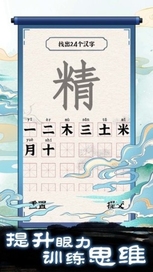 1、观察联想破谜题:部分关卡需从水墨场景中找出隐藏的汉字元素,考验观察力与图形联想能力。