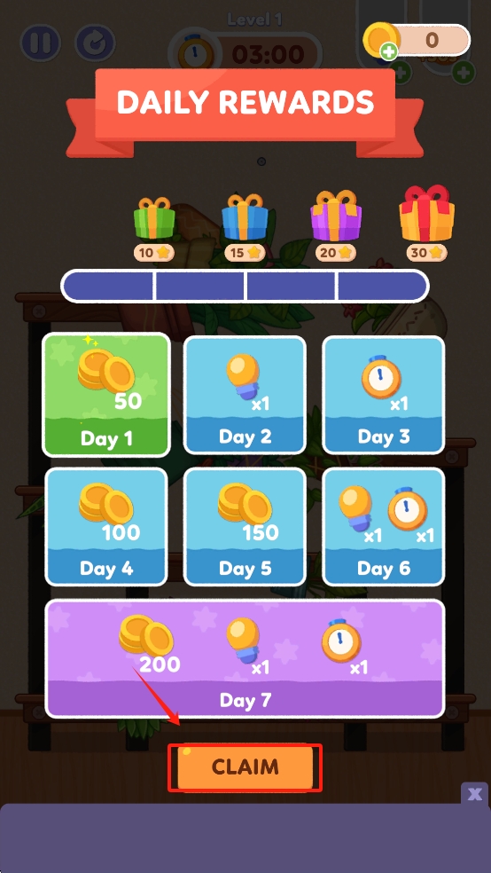 1、点击下方‘CLAIM’按钮领取每日签到奖励,包括金币、道具等丰富福利。