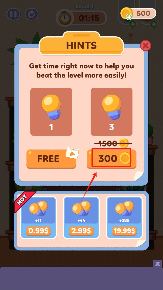 3、点击‘HINTS’可获取游戏提示,花费300金币直接购买。