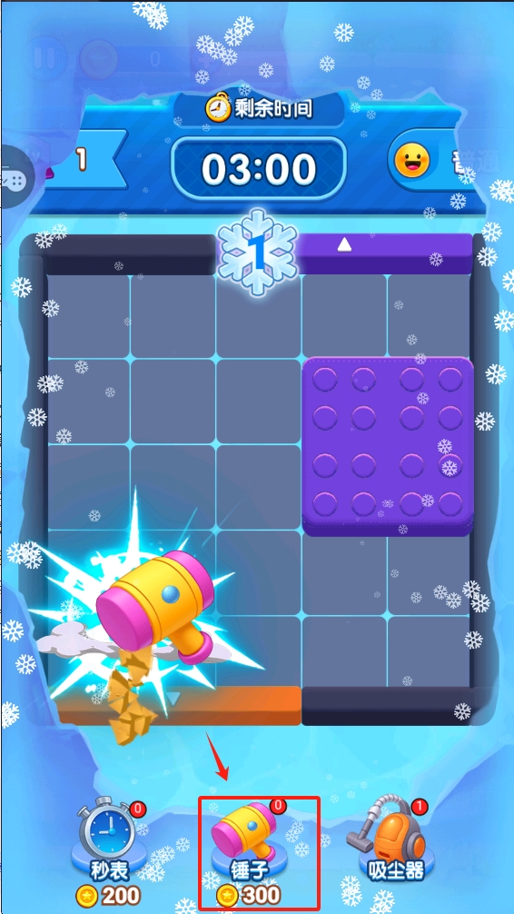 4、点击锤子图标,花费金币使用锤子移除游戏方块,帮助通关。