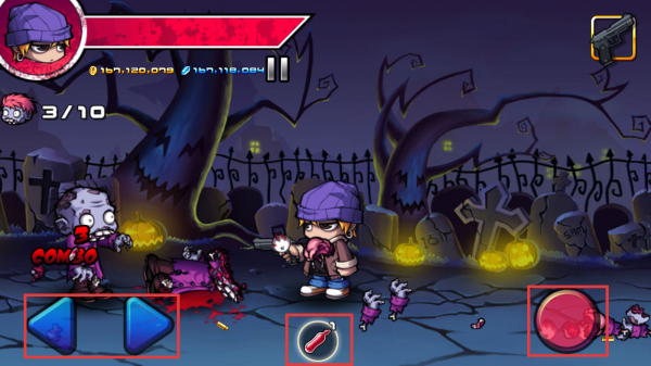 3、点击蓝色三角键移动角色,面朝僵尸后,点击右下方按键进行射击,受到伤害时点击中下方的药剂可以恢复血量。