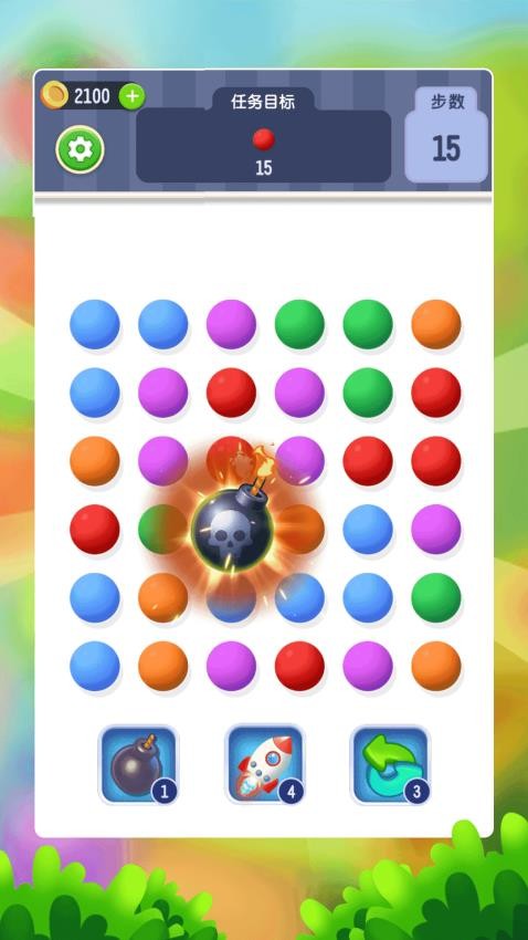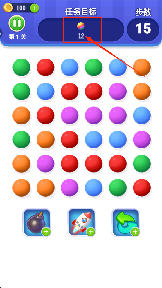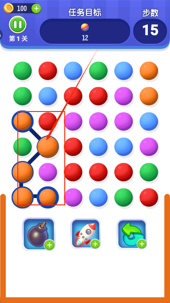 1、基础消除操作:滑动连接相同颜色球球,点击使用道具。