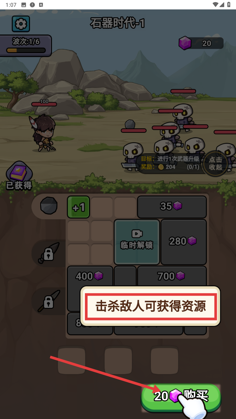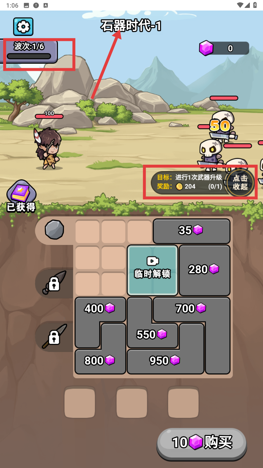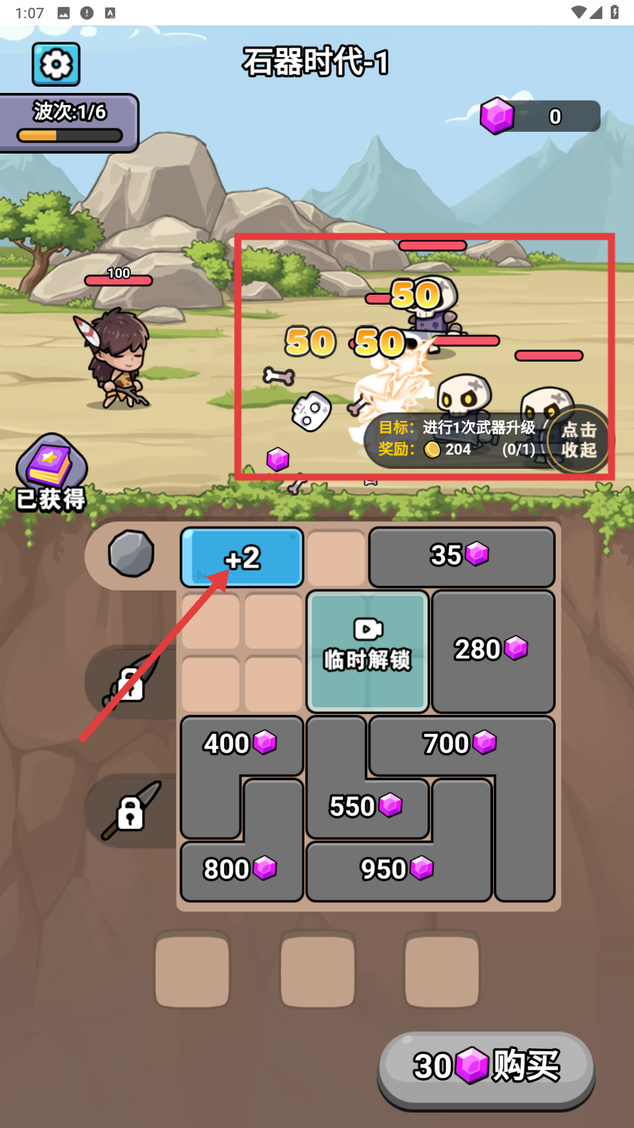 1、进入【石器时代-1】关卡后,注意界面左上角的【波次1/6】,了解当前波次进度。
