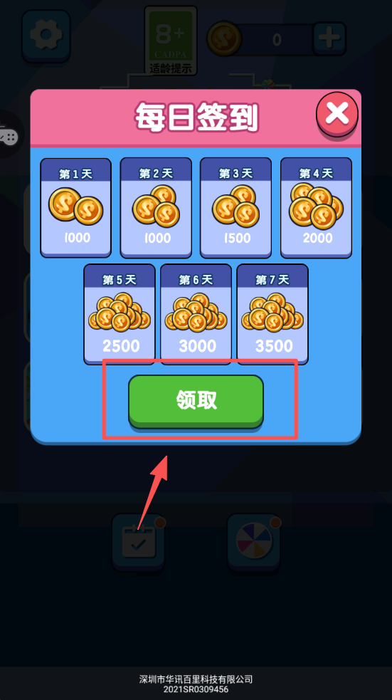 2、每日签到可获得金币奖励,点击“领取”按钮获取。