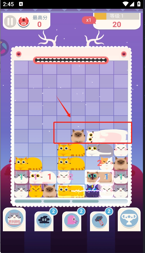 2、在游戏界面,拖动下方的猫咪图案到网格中,形成三个或以上相同图案的直线即可消除得分。