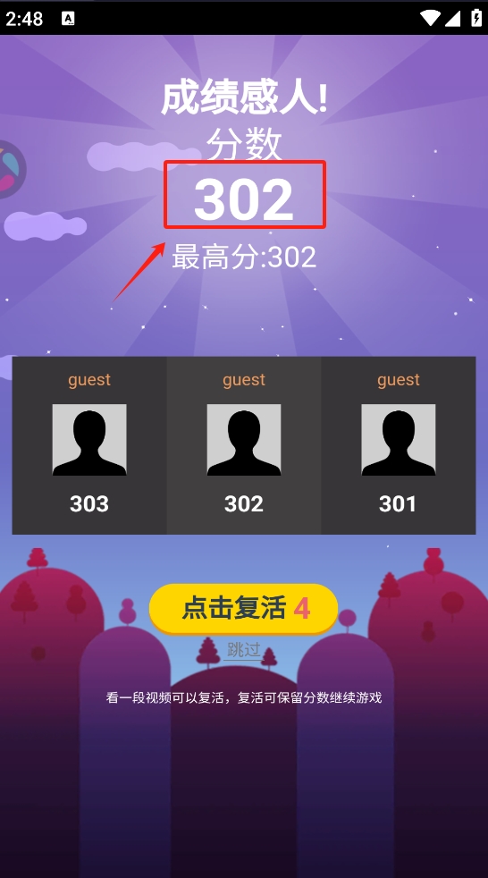 3、游戏结束后,分数会显示在屏幕中央,红色框内即为你的得分。最高分也会显示在下方。