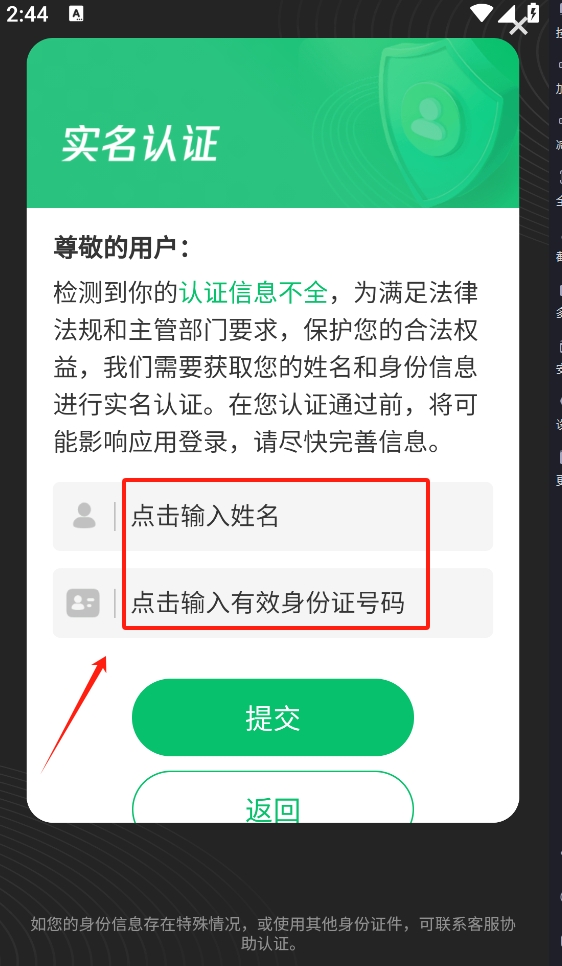 1、点击输入框填写姓名和身份证号码,点击“提交”按钮完成认证,以确保账户安全。