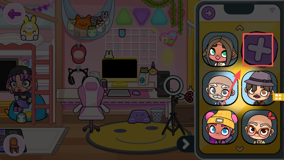 3、点击加号按钮,打开角色装扮菜单,选择发型、服装等装扮元素。