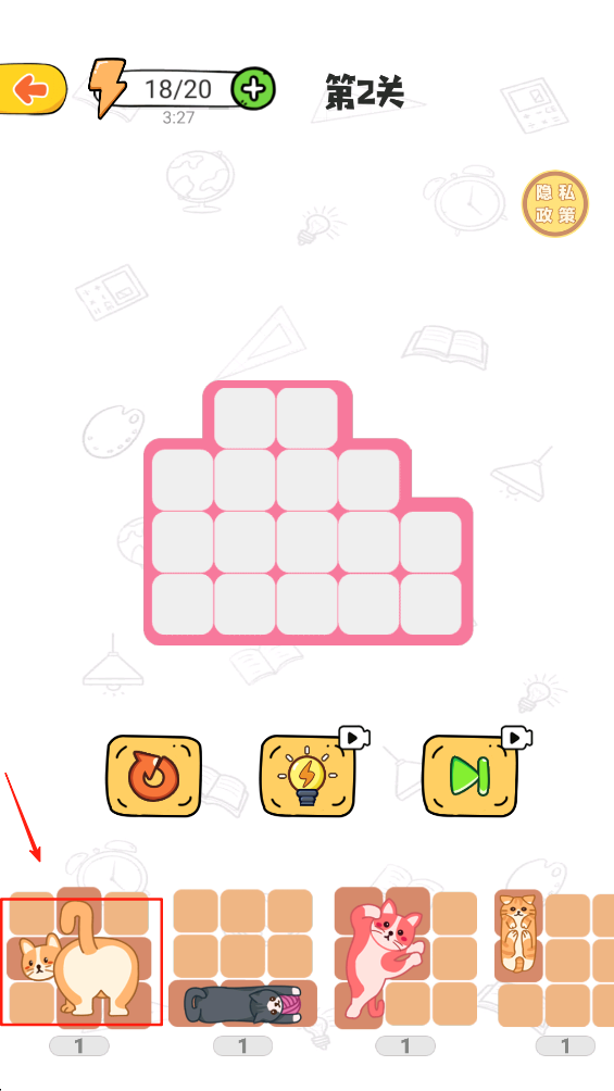 2、成功关键在精准匹配:必须仔细观察每只小猫当前的肢体动作,如伸爪、弓背、侧卧,判断其需要占据哪些特定形状的方格组合。