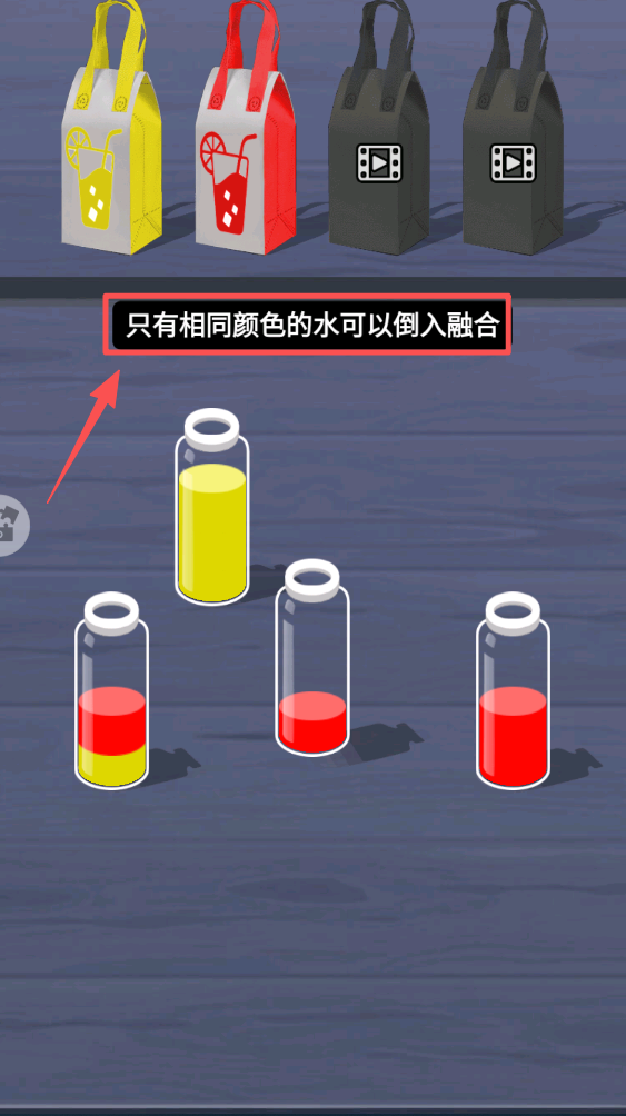 3、只有相同颜色的水可以倒入融合,创造新的颜色组合。