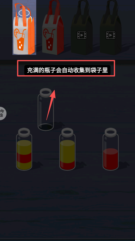 2、将相同颜色的液体倒入瓶中,充满的瓶子会自动收集到袋子里。