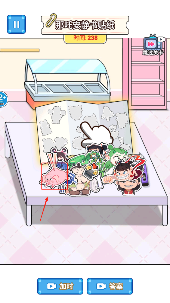 3、拖动下方的贴纸到正确的位置,完成那吒安静书的拼图,注意时间限制。