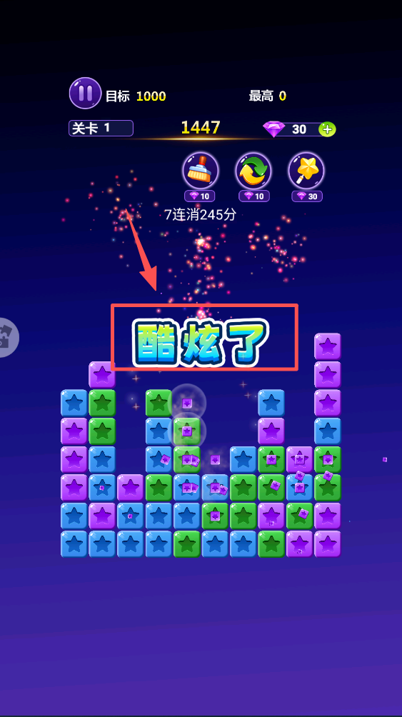 2、找到并点击相同颜色的星星进行消除,连续消除可获得更高分数。
