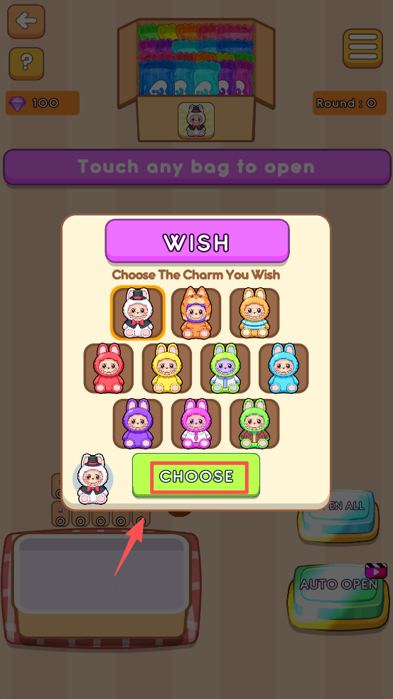 4、在许愿界面,点击“CHOOSE”按钮,选择你希望获得的Charm,开始你的幸运之旅。