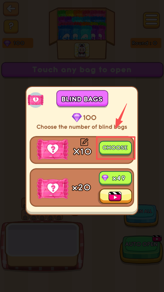 3、在盲袋选择界面,点击“CHOOSE”按钮,选择你想要的盲袋数量。