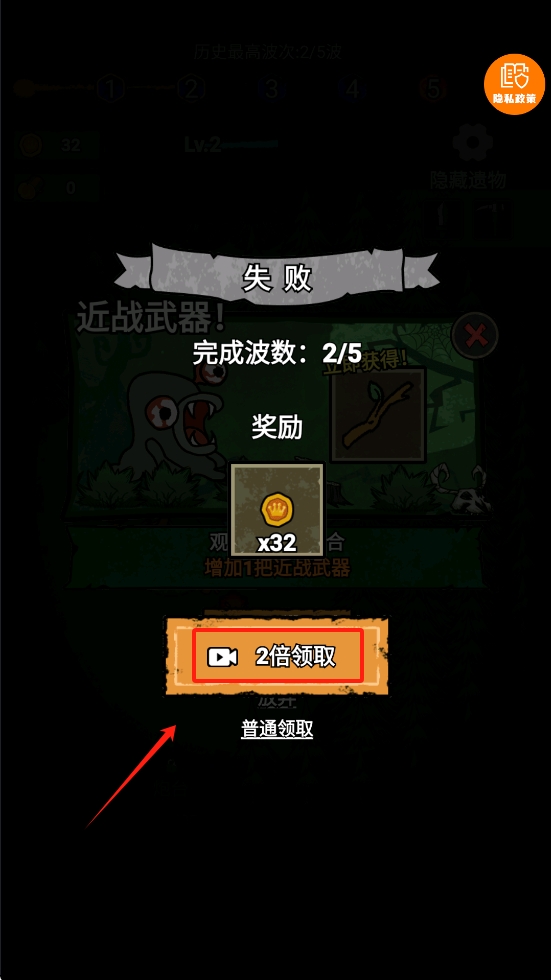 4、完成游戏后,你可以选择观看广告来双倍领取你的奖励。