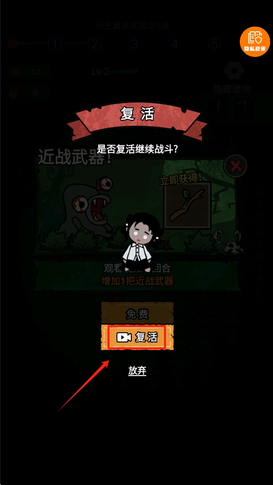 3、如果你在战斗中失败,可以选择是否观看广告来复活并继续战斗。