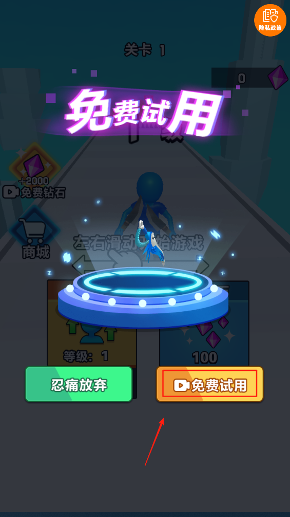 1、进入游戏,点击“免费试用”来获取钻石,提升等级和能力。