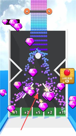 3、到达终点区域,按箭头指示方向,操控小球撞击更多【x5】等倍数标识的钻石,获取大量钻石奖励。
