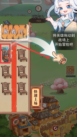 2、点开【聚义厅】,将招募的英雄拖动至战场,即可自动战斗。