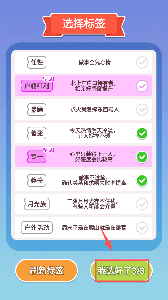 3、选择角色标签,根据喜好勾选,点击“我选好了”确认选择。