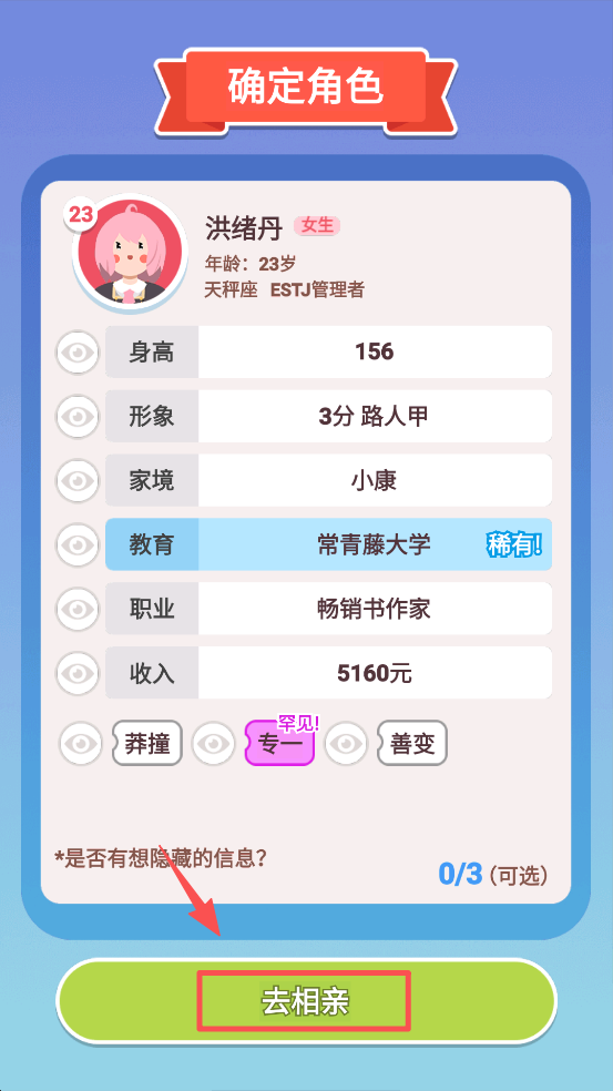 4、确认角色信息无误后,点击“去相亲”按钮,开始游戏之旅。