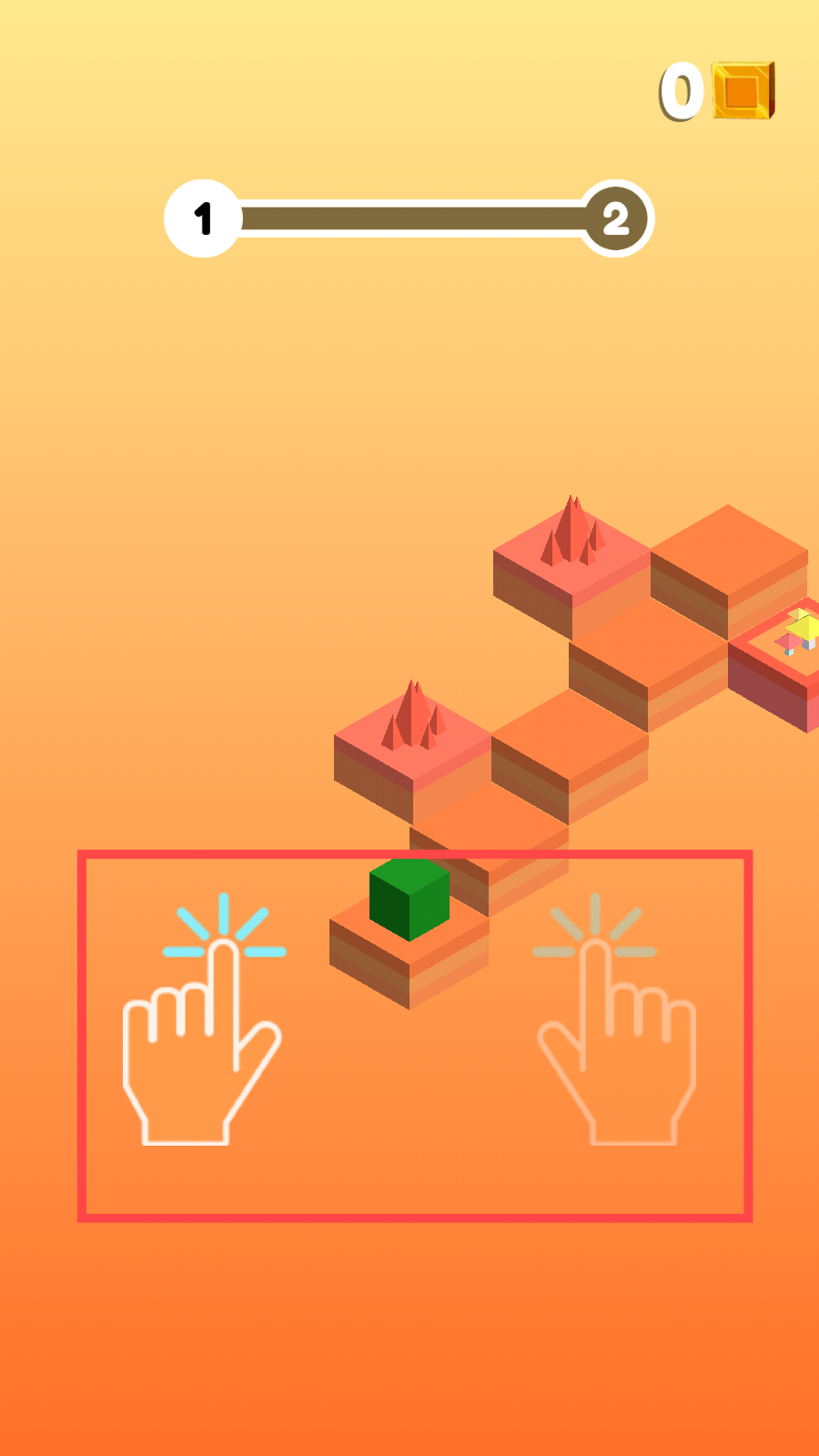 1、进入游戏后,通过点击屏幕下方左右两侧的手指图标【控制方块移动】,躲避障碍物,向目标前进。