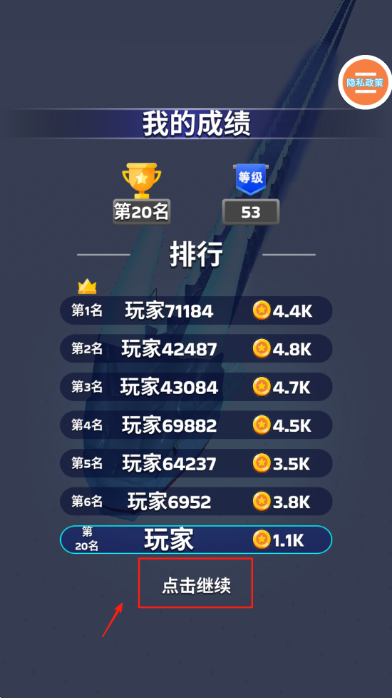 4、查看你的游戏成绩,了解自己的排名和等级,点击“点击继续”按钮继续游戏。