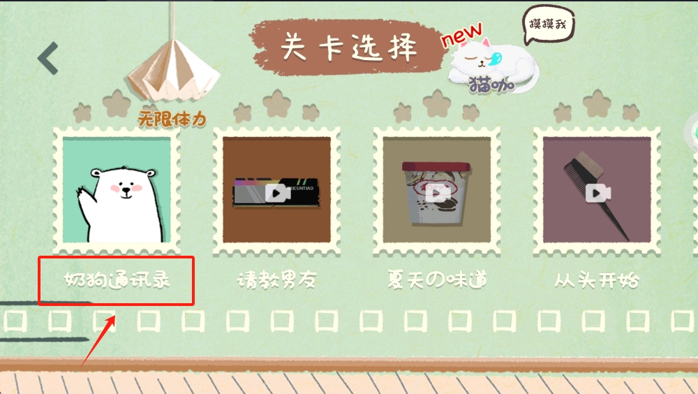 3、在关卡选择界面,点击你想要挑战的关卡,如“奶狗通讯录”,开始游戏。