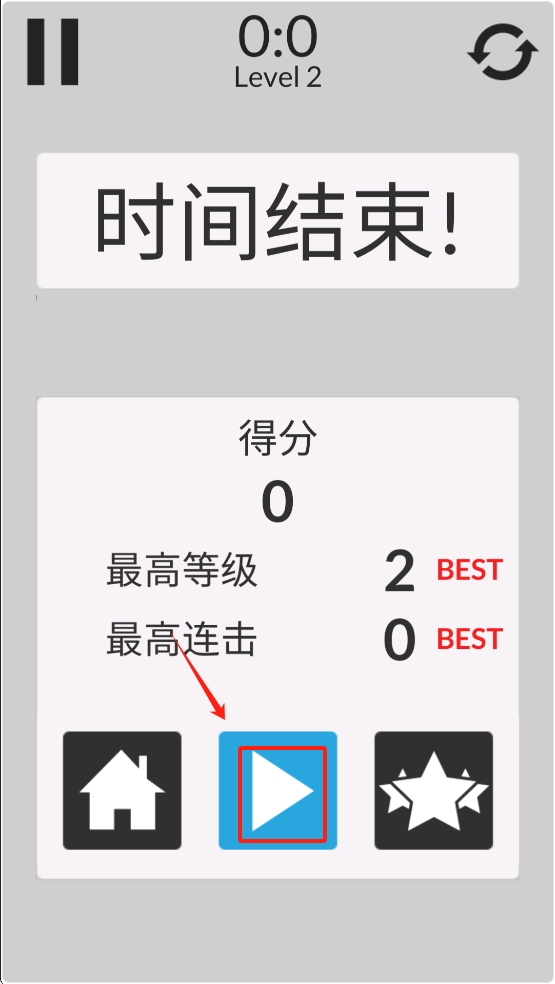 3、若倒计时归零,立即查看“得分”与“最高等级”,继续挑战。