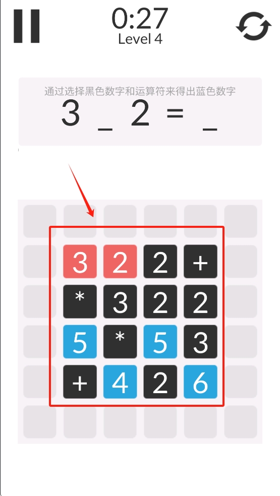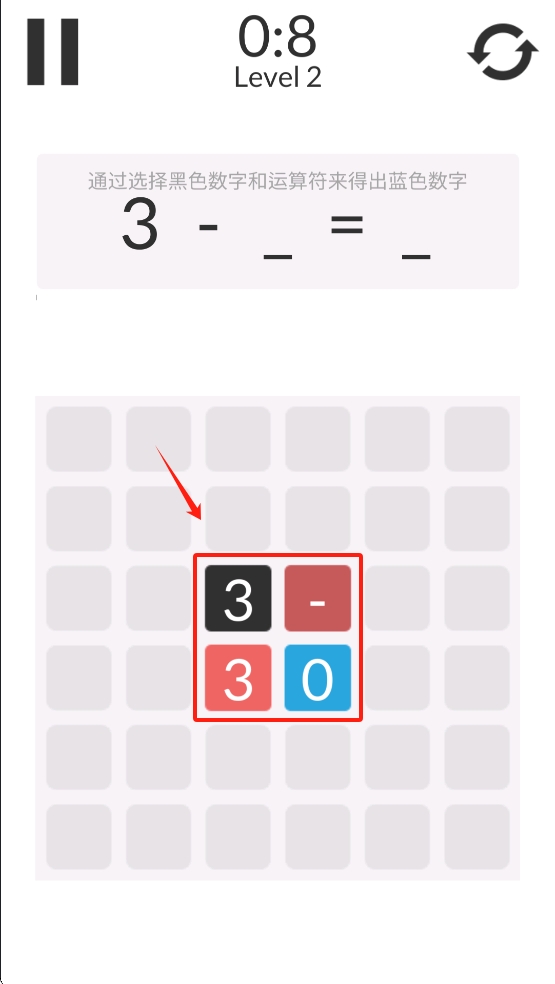 2、在Level 2,用手指依次点选黑色数字与运算符,使算式结果等于蓝色数字3。