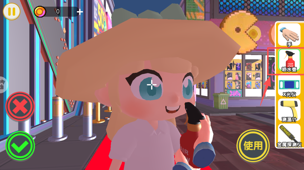 3、在游戏界面,选择并使用喷水壶等道具,执行你的保安职责。