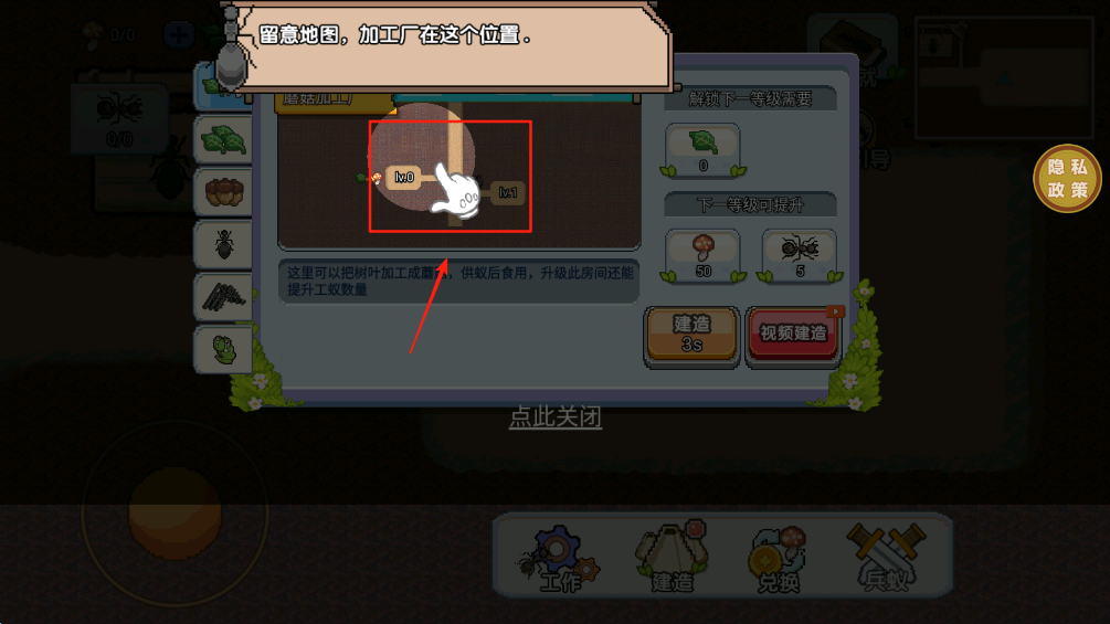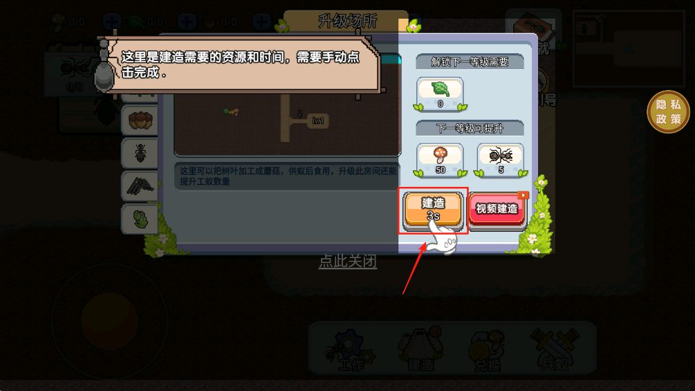 4、在建造界面中,你会看到“建造”按钮,点击它蘑菇加工厂就建造完成了。